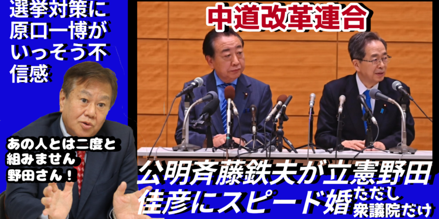 『中道改革連合』公明斉藤鉄夫が立憲野田佳彦にスピード婚 ただし衆議院だけ 選挙対策に原口一博がいっそう不信感
