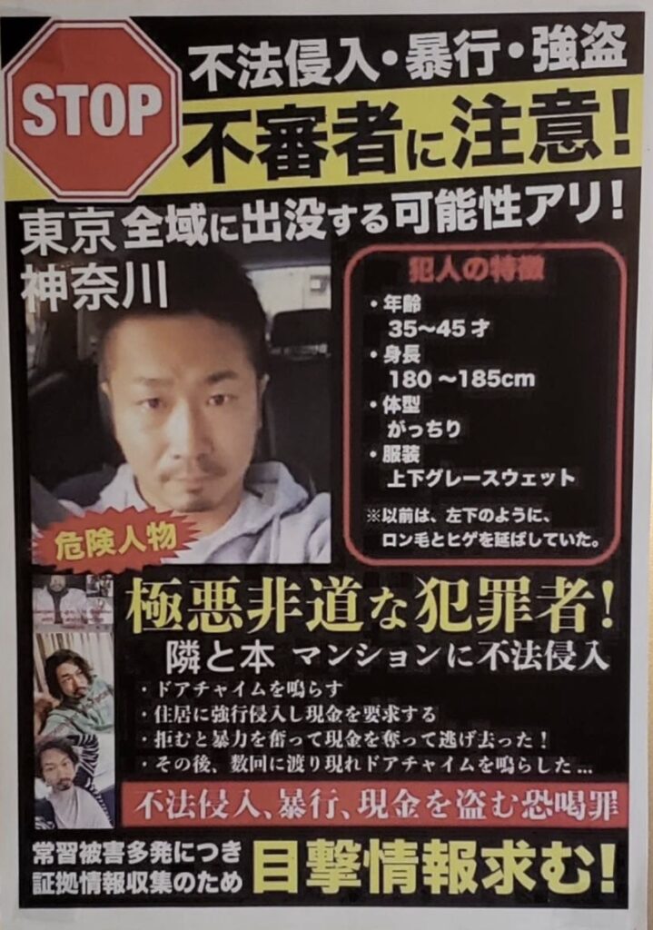 関東近郊で被害が拡大してますため周囲の方、とくに一人暮らしの女性の方や夜間に帰宅する方へ、共有してください。