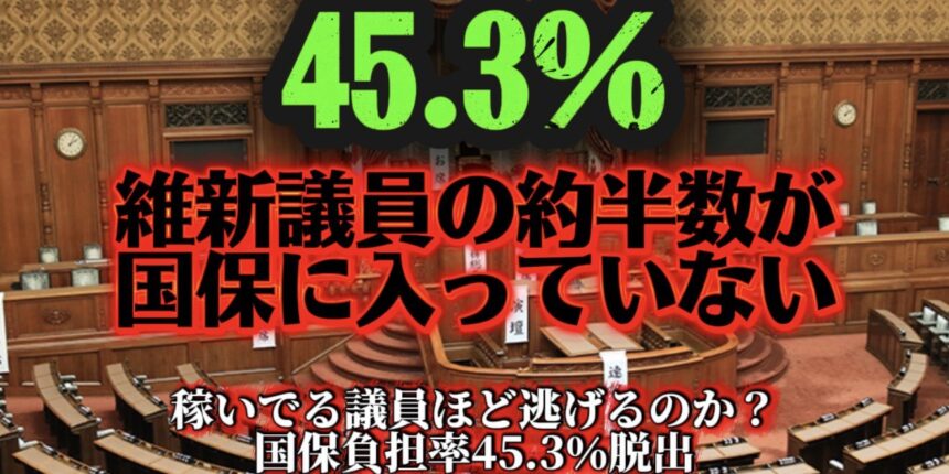 維新議員の364人、全体の45.3%。所属議員の約半分が国保に入っていないという数字が表に出てきた。もちろん、正規に会社の健康保険に入っている議員もいるだろう。