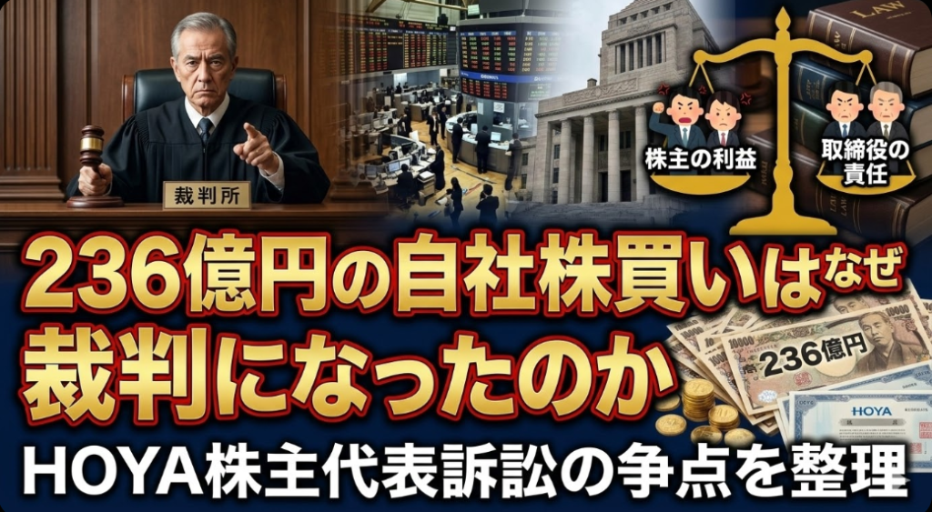 2026年2月、HOYAは、2016年の自己株式取得をめぐって株主代表訴訟が東京地方裁判所に提起されたと公表した。会社開示によれば、争点となっているのは、2016年2月16日の取締役会決議に基づき同年4月8日までに実施された合計300億円の自己株取得のうち、236億2400万円分が「分配可能額」を超える違法な取得だったのではないかという点である。HOYAは2026年2月19日に訴訟告知を受け、2月24日にその事実を公表した。