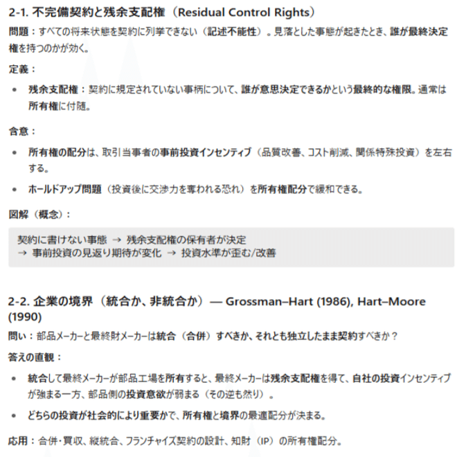 小結:ハートは「書けない契約」を前提に、所有権と権限の配分が投資・努力をどう変えるかを解いた。