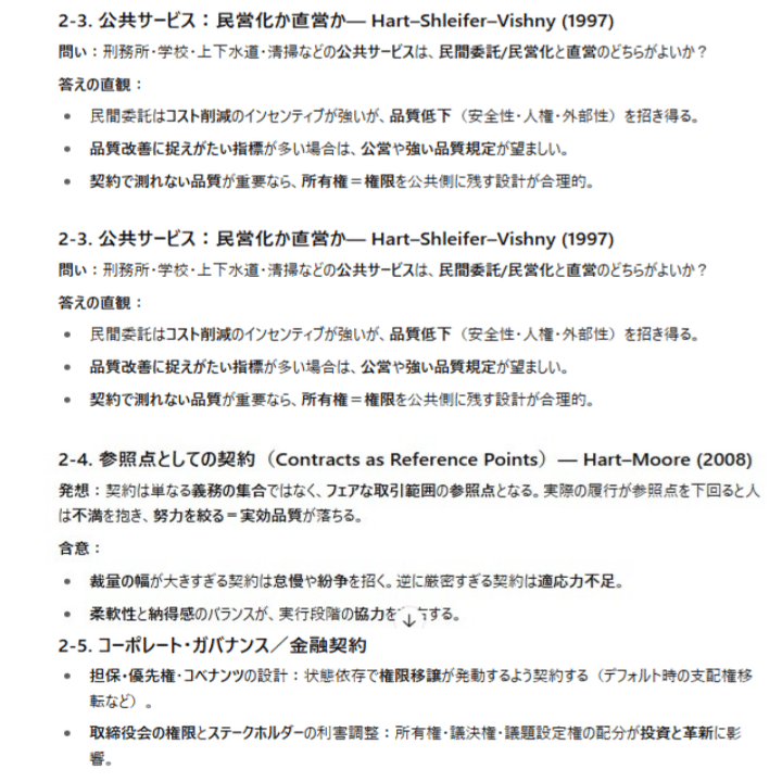 ハートの契約理論は、完全契約の幻想を捨て、書けない未来に備える設計学である。所有権=権限を投資インセンティブに沿って配分し、品質不可観測な公共サービスでは直営や強規制を組み合わせる。AI・データ・気候移行の時代、誰が最後に決めるのかを明確にすることが、最も実務的で、最も戦略的な選択だ。
