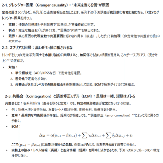 インフレ、金利、為替、株価、CO₂ 排出量――いずれも時間とともに平均や分散が揺れる非定常系列だ。古典的な回帰分析でこれらをそのまま回すと、見かけだけの高い決定係数と有意性が並ぶ「もっともらしい誤り(spurious regression)」に陥る。