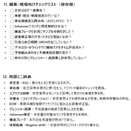 Johansen 検定など多変量の一般化、Bai–Perron の構造変化、Markov 転換、状態空間、局所時定数、因果探索(PCMCI、TiMINo 等)への橋渡し。
