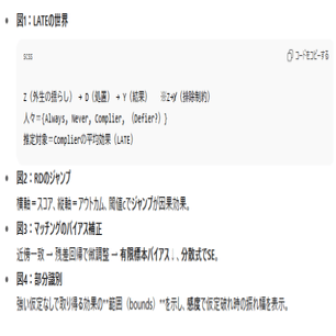 どの効果を・どの仮定で 同定しているのかを可視化したことだ。” LATE は、推定対象を曖昧にしない誠実さの規範であり、RD の実務整備とマッチングの厳密化は、開発・教育・医療・労働など幅広い現場に再現可能な手順を与えた。
