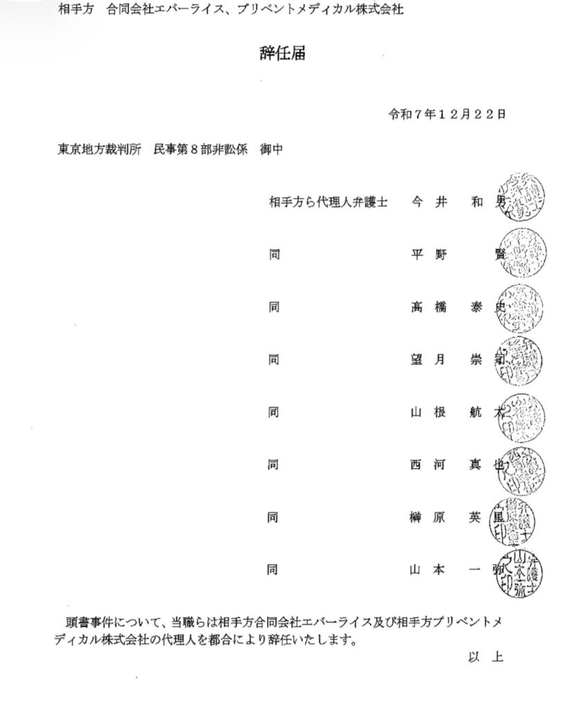 東京地方裁判所で係争中の非上場株式売買価格決定申立事件(令和5年(ヒ)第393号)および関連する文書提出命令申立事件(令和7年(モ)第77016号)において、申立相手方である合同会社エバーライスおよびプリベントメディカル株式会社(代表者:篠原慶こと久米慶)の代理人を務めていた弁護士9名が、2025年12月22日付で一斉に辞任したことが分かった。
