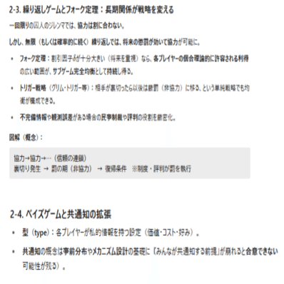繰り返しゲームで、長期の信頼・懲罰・評判のメカニズムを数学化。