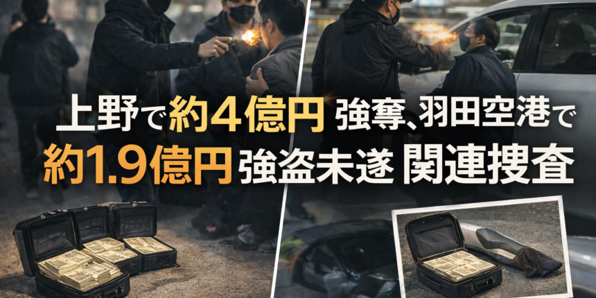 警視庁は、上野での強盗事件、羽田空港での強盗未遂事件、さらにひき逃げ事件について、同一グループによる一連の犯行の可能性があるとみて、強盗および強盗未遂容疑で捜査を進めている。