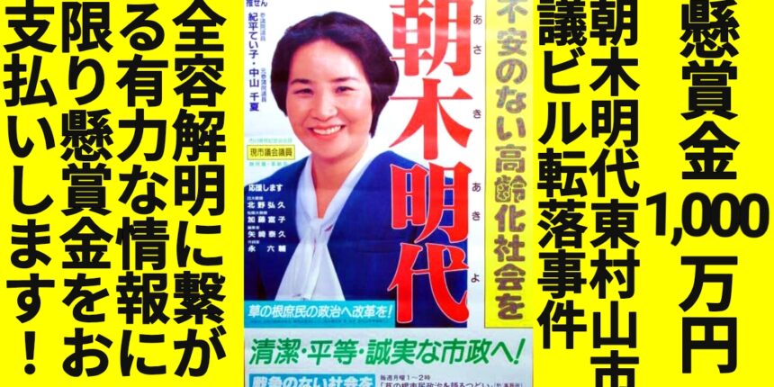 懸賞金1,000万円!朝木明代東村山市議ビル転落事件。全容解明に繋がる有力な情報に限り懸賞金をお支払いします