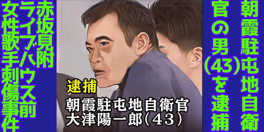 2025年11月16日に東京・港区赤坂で発生した女性歌手刺傷事件で、警視庁は21日、逃走していた43歳の自衛官の大津陽一郎容疑者を殺人未遂の疑いで逮捕した。男は陸上自衛隊朝霞駐屯地に勤務する、都内在住の自衛官だったことが判明した。