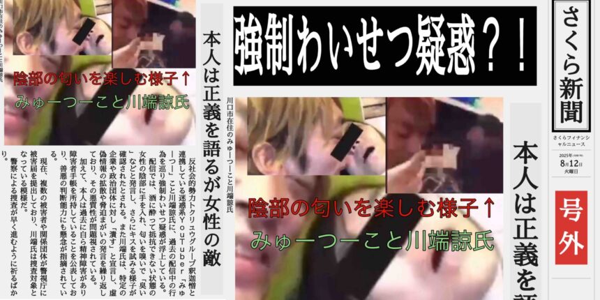 反社会的勢力トクリュウグループ釈迦憎と連携している迷惑系YouTuber「みゅーつー」こと川端諒氏に、過去の配信中の行為を巡り強制わいせつ疑惑が浮上している。