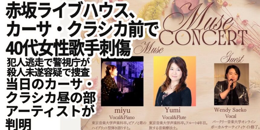 被害女性は「歌手」40代 出演予定前に襲われた。